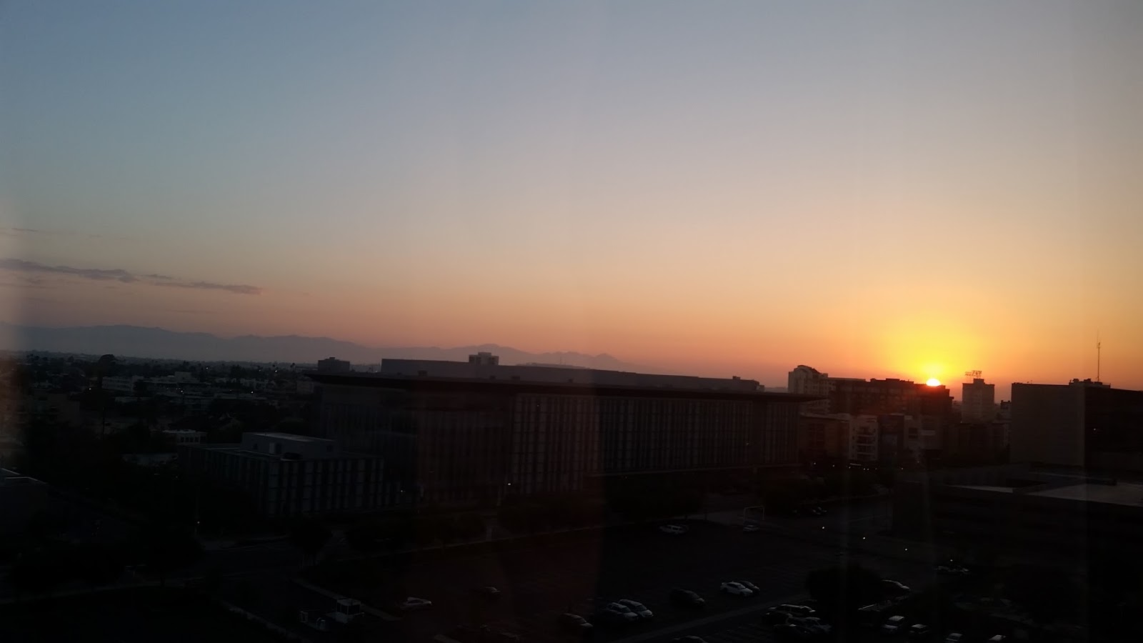 we were both excited to get to the hotel and start resting, doing laundry, showering, and eating. Here is the view from the 9th floor. Hank was a little scared at first, but I helped him calm down. You can see the hazy smoke in the distance from the wildfires.